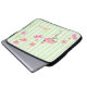 Pretty laptop cover done in a white and light green striped pattern. Graphics of pink flamingo and colourful pink and peach flowers decorate the striped background. Pink script text, on the bottom, is ready to personalise with your name. Makes a great gift idea. Chose the size you need.