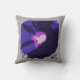 The image on this square, Polyester throw pillow is a purple-pink Morning Glory flower. The background is a complementary grey.
