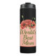 Pretty design features watercolor red poppy flowers spray with black border and green "World's Best Mum" text