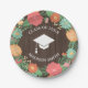 Rustic floral paper plates for a graduation celebration. These pretty paper plates features a flower wreath against a wood grain background. The flowers are coral pink, warm yellow, mint green, and orange. Inside the floral wreath, a white graduation cap. Personalise the paper plates with the year and the name of the graduate.