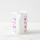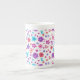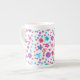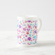 A pretty Bone China Mug to personalise, with a pattern of flowers in purple, turquoise, pink and orange on a white background, from a handpainted paper collage by Judy Adamson.