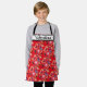 Pretty, customisable, apron with black text, featuring hand drawn and digitally designed colourful, foil textured, red, orange, pink, purple, stack, double heart lollipops pattern on a red background.