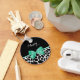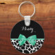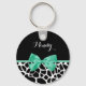 A girly black and white giraffe print keychain with a pretty mint green ribbon tied into a cute bow. Personalise this trendy animal print design by adding your name. Flat printed image, not actual bow.