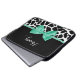 A girly black and white giraffe print 15'' laptop sleeve with a pretty mint green ribbon tied into a cute bow. Personalise this trendy animal print design by adding your name. Flat printed image, not actual bow.