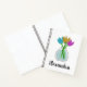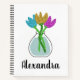 Add your name to this lovely sketchbook to make it yours. Three flowers in blue, gold, and pink with a glitter effect in a vase with water are featured in the design.