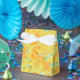 A Tent Favour or Gift Box, with a pattern of golden daffodils, from a handpainted watercolour design by Judy Adamson. This pattern can be adjusted to fit any Gift Bag of Box.