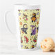 A cup of latte decorated with Halloween festive illustrations, such as smiling pumpkins, ghosts and bats. The coffee is covered with a creamy mousse, with a light sprinkling of chocolate in the shape of a spider web. Perfect for enjoying a relaxing drink during the autumn evenings!