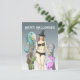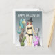 The pretty witch stands with her funny and creepy friends on a Halloween postcard.