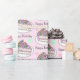 Pink and green birthday cake, flowers, roses, butterfly and polka dots Birthday gift wrap.