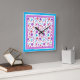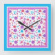 A pretty, square Wall Clock, with a pattern of flowers in purple, turquoise, pink and orange on a white background with a lavender and turqoise border, from a handpainted paper collage by Judy Adamson. You can easily change the background colour by using the Edit button.
