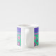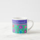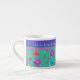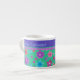 A pretty Espresso Mug to personalise, with a pattern of flowers in purple, turquoise, pink and orange on a Jade Green background, from a handpainted paper collage by Judy Adamson. You can easily change the background colour by using the Edit button.