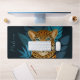 This stunning desk mat features a hand drawn / painted leopard, with tropical jungle leaves in shades of blue over a custom colour background (shown in dark navy blue). A text template is included for easy personalisation. Modern, beautiful, and unique - makes a great gift!