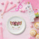 Sweet baby shower paper plate done in white, with graphics of a gold thin rim around the outer edge. Graphics of an adorable kitty face with pink heart shaped nose, big golden eye lashes and ears, with pink flowers, decorates the centre of the plate. Customise to add any text you want. Matching products are available.