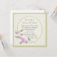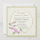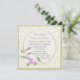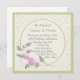Pretty square floral birthday invitation has a Victorian era elegant. The square invitation has a tiny tan on cream floral background, with a round text area decorated with a sprig of pretty pink flowers. Customise the text for your party celebration, with text colours, text size, font style, and wording.