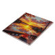 Ceramic tile with a pretty illustration of a sunrise in the morning overlooking a lake view at a lake houses with a cup of warm coffee sitting on the ledge.