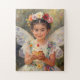 A puzzle with an illustration of a pretty Hispanic girl with flowers in her hair holding a cupcake with white wings and a vintage dress done in an impasto vintage style.