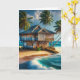 Happy Anniversary card. Pretty ai art with a big log cabin beach house on the ocean watercolor style with palm trees blowing in the breeze.