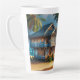 Pretty ai art with a big log cabin beach house on the ocean watercolor style with palm trees blowing in the breeze.