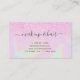 Modern makeup business card design featuring colorful faux holographic & purple glitter texture, elegant calligraphy font.