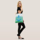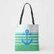 Pretty all over print tote bag done in a green, sky blue and white nautical theme. Stripes running across the middle of the bag with coordinating polka dot patterns decorate the top and bottom of the bag. A big sky blue anchor decorates the middle centre of the bag, with custom white text ready to personalise. Great all purpose Summer bag.