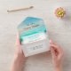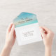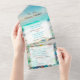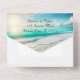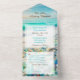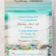 All-in-one wedding invitations with a blue and teal ocean view with a sandy beach full of sea glass.
