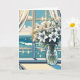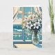 Birthday Card. A pretty glass vase of tropical white flowers and a gorgeous view out a pretty window of a sparkling ocean.