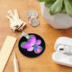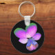 This keychain features a photograph of a wild Pansy flower. The photo has been artificially coloured resulting in a pansy with glowing pinkish purple petals with green tips petals and a deep blue centre. The background is black to make the flower stand out.
