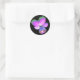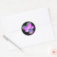 This sheet of round stickers features a photograph of a wild Pansy flower. The photo has been artificially coloured resulting in a pansy with glowing pinkish purple petals with green tips petals and a deep blue centre. The background is black to make the flower stand out.