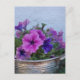 Pretty purple and pink petunias in a vintage silver kitchen pot