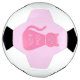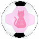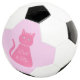 This awesome soccer ball features a digital art image of a pretty pink cat with a curly tail. Her eyes are pale pink with black pupils and she has long black eyelashes. She is wearing a pink bow in her hair and a beautiful pearl necklace around her neck.