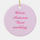 This ornament features a graphic image of a cute white Stork with black tail feathers holding onto a pale pink bundle of blankets. There is pink text on the bundle that says "Baby Girl". This design is perfect for celebrating a baby girl. There is custom text so you can include the name of your baby girl and her date of birth. This ornament would make a lovely birth announcement or gift for a new Mother as well as a lovely first Christmas gift.