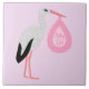 This awesome tile features a graphic image of a cute white Stork with black tail feathers holding onto a pale pink bundle of blankets. There is pink text on the bundle that says "Baby Girl". This design is perfect for celebrating a baby girl.