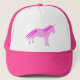 This awesome hat features a digital art image of a pretty magical pink baby girl unicorn. The main body of the unicorn is pink and the mane and tail are two different shades of pink. The unicorn has golden hooves and a bright shiny gold horn on top of its head. It has a pink diamond shaped eye. The unicorn has a big smile on its face.
