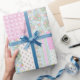 A roll of chic Giftwrap, with a pretty, nostalgic faux patchwork pattern of pink Dogroses on a sky blue background with matching polka dots, stripes and plaids. Part of the Posh & Painterly 'Rosy Posy' collection, this pattern can easily be adjusted to fit any roll of Wrapping Paper.