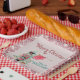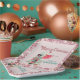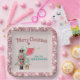 This glamourous custom holiday party plate features an illustrated Nutcracker Christmas theme. An image of the Nutcracker and Sugar Plum Fairy standing in front of a Christmas tree is placed at the bottom. The background is a soft blush pink colour with teal coloured font. A pretty, faux pink glitter frame borders the image.
