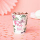 Simple Pretty Pink Girl's Pool Party Birthday Paper Cups. Design features a simple white background decorated with tropical foliage, flipflops, sunglassess and a fun POOL Party heading!