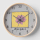 This is a beautifully designed clock that you can personalise with your name. It features a pen and ink drawing of a pink rose. The rose has a yellow background inside a black line border. The background colour is pale grey, and the clock has black numbers with a pale wood surround. The artwork is original, and only available from The Art of Being Beth.