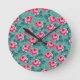 Pretty Pink Roses and Polka Dot Pattern on Teal Round Clock