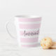 This latte mug features a pretty pink rose design on a pink and white striped background. Personalise this mug with your name or other text.