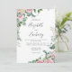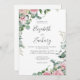 This elegant modern wedding invitation features pink watercolor floral bouquets accented with eucalyptus greenery in two corners on a white background. The customisable text combines charcoal grey whimsical handwriting, copperplate and italic fonts. The reverse side is solid white.