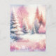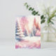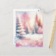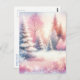 Pretty pink winter wonderland Christmas postcard. A pink forest with pine trees covered in snow.
