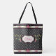 Stylish all over print tote bag done in black, with a white polka dot pattern. Graphics of a pretty ribbon with pink roses decorate the top and bottom of the bag, and a decorative text area, in the middle. Personalise the pink text to read what you want. Pretty carry all bag that makes an excellent gift idea for her.