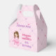 This adorable pink princess birthday party favour box features a pretty brunette little girl wearing a beautiful pink ball gown. Personalise this cute children's party gift with your child's name and age in lovely purple between the fun heart pattern.