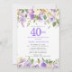 Honor a special woman with this elegant and feminine 40th Birthday party invitation. 40th is written in large purple text. Birthday celebration follows. The honored guest's name is also in purple capital letters. The birthday celebration details are surrounded top and bottom purple floral borders. The floral elements are nestled in deep green leaves. While it is a traditional design, the open and airy botanical foliage and text give it a contemporary vibe.
