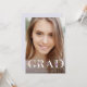This beautiful, trendy graduation party invitation features a photo of the graduate on the front, with modern white text decorated with lovely watercolor purple flowers. All of your grad party information goes onto the back, on a subtle light purple background.