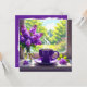 A pretty blank notecard with a gorgeous illustration of a vibrant purple lilacs sitting in a glass vase on a window sill next to a steaming cup of warm coffee on a bright summer day. The back is blank so you can write a note to a friend.