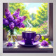 A pretty poster a gorgeous illustration of a vibrant purple lilacs sitting in a glass vase on a window sill next to a steaming cup of warm coffee on a bright summer day.