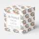 Pretty rainbow abstract pattern wedding square favour box with two beautiful arcs of colour around your names and date. These simple colourful boxes are perfect for a classy LGBTQ couple getting married in the afternoon. Beautiful wave pattern.