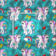 A colourful and cute unicorn fabric with a pattern of sweet little unicorns with rainbow-coloured tails, pink and purple manes with flowers in their hair and pink wings. They're on a pattern of aqua/teal rippling silk with little gold bows, red gel hearts and rainbows scattered all around them. This cute unicorn fabric would be suitable for kids' clothing, cushion covers to decorate a little girl's bedroom, curtains, home decor, kids' unicorn parties and more.