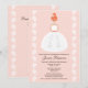 Customise and personalise this pretty bridal shower invitation with a light pink textured background and a pretty, redhead bride in a strapless wedding gown with a pink sash and pretty flourish pattern on her skirt. She wears a flower in her hair and accessorises with a lovely pair of tear drop shaped dangle earrings. Click on the following link to see all of our original Chrissy H. Illustration © Chrissy H. Studios, LLC